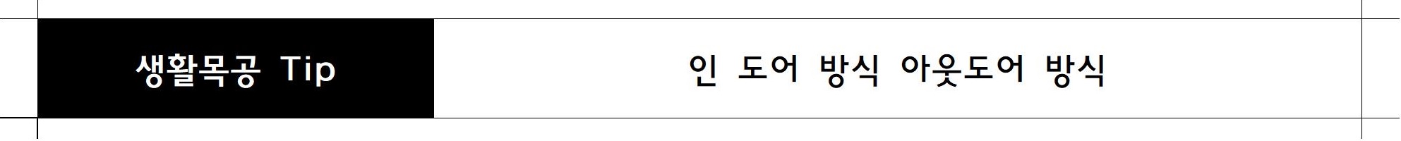 • 보통 문이 달리는 프레임을 덮을 경우는 아웃도어 방식이라 부르며 프레임 안쪽으로 결합되면 인도어 방식이라 부른다. 그렇기 때문에 싱크 경첩을 주문할 때에는 이 점을 구분해야 한다. 또한 인 도어 방식일 경우 반드시 스토퍼 또는 캐치링이 있어야 한다.