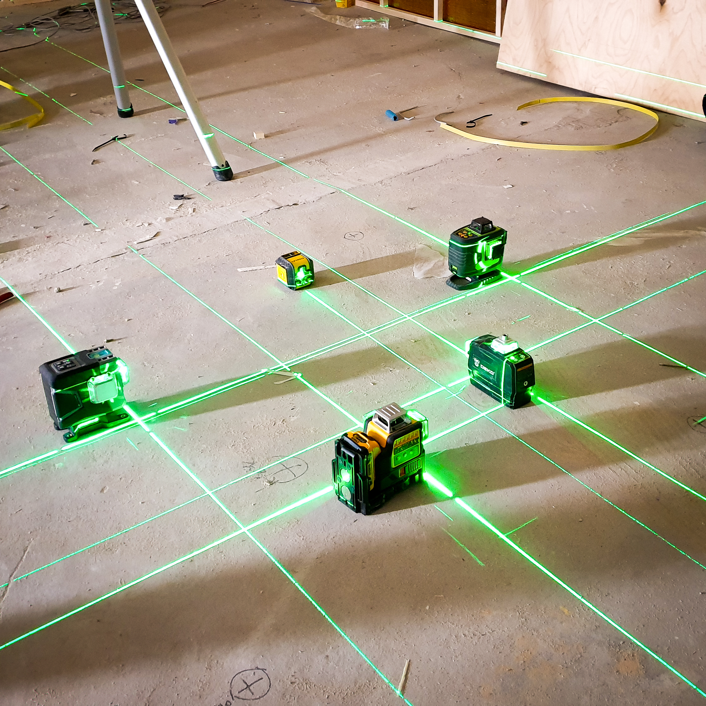 여기서 중요한 것은 가능한 한 수직과 수평을 맞춰야 한다는 점이다. 기존의 콘크리트 벽이 곧게 세워지지 않았기에 가벽 작업을 하는 것이기에 시각적으로 안정감 있는 공간 구성을 위해선 반드시 필요한 기본 작업이다. 이를 위해서 다양한 공구와 목수 각자의 경험이 중요해진다. 20년 전만 하더라도 물을 넣을 수 있는 물관을 이용하여 수평을 잡았고, 추를 이용하여 수직을 잡았다. 20대 중반, 처음 일을 배울 때만 하더라도 추를 조심스레 띄우고, 물관으로 수평을 잡는 것이 쉽지는 않았다. 그렇기에 작업자의 경험과 예측이 중요했다. 목수가 갖춰야 할 가장 중요한 실력이기도 했으니까.